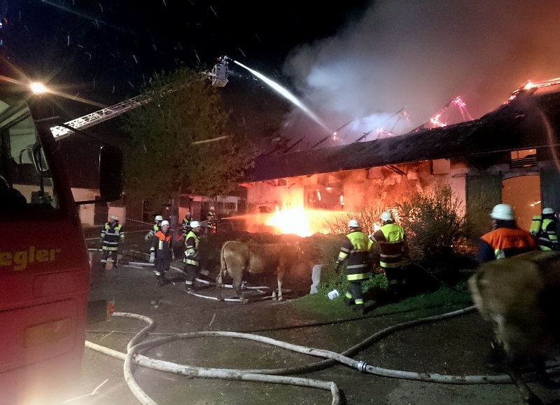 Zum Zeitpunkt des Brandausbruchs befanden sich in dem 30 mal 16 Meter großen Gebäude neben 2.000 Litern Heizöl auch 30 Rinder – alle Tiere konnten glücklicherweise gerettet werden.