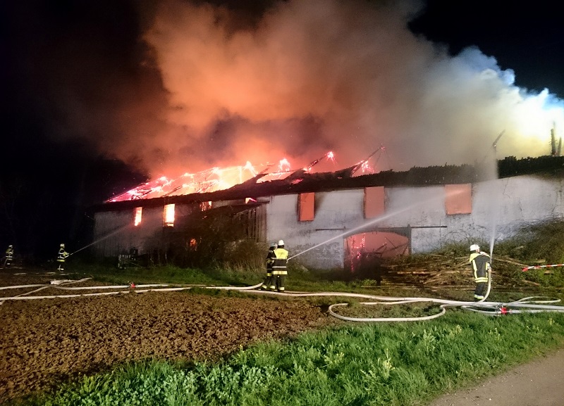 Zum Raub der Flammen ist eine landwirtschaftliche Halle in Obertsloh (Gemeinde Hilgertshausen-Tandern) am Montagmorgen (25.04.2016) geworden. Um kurz nach 3.00 Uhr wurde ein Großaufgebot der Feuerwehr alarmiert, als kurze Zeit später die ersten Kräfte die Einsatzstelle erreichten stand das Stallungsgebäude auf dem landwirtschaftlichen Anwesen bereits im Vollbrand.