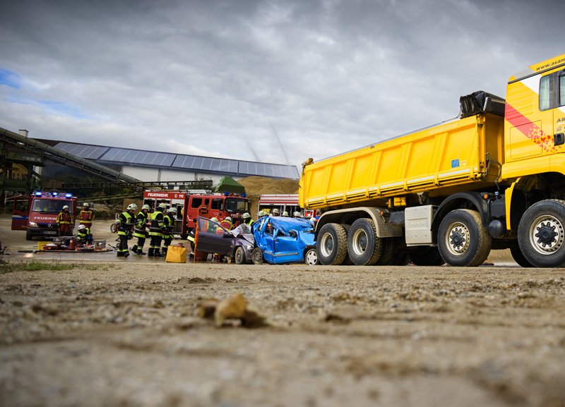 Das zweite Szenario stellte einen schweren Verkehrsunfall mit eingeklemmten Personen dar. Zwei PKW waren nach einem Auffahrunfall auf einen LKW stark deformiert.