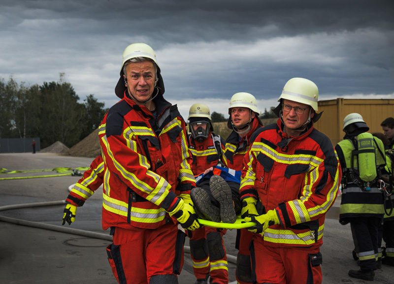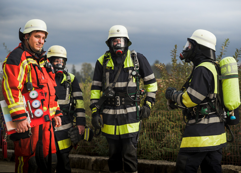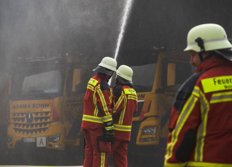 Im ersten Szenario, welches sich mit der Brandbekämpfung beschäftigte, mussten die Einsatzkräfte einen Kellerbrand mit vermissten Personen bewältigen. Eine besondere Herausforderung war hierbei, dass das verrauchte Gebäude mit einer Fahrzeughalle verbunden war.
