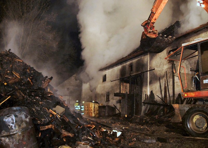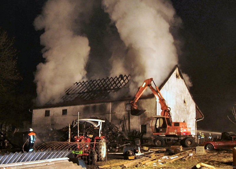 Einem Großfeuer fiel am Dienstag Nachmittag der Stadel eines landwirtschaftlichen Anwesens in Oberdorf, Gemeinde Hilgertshausen-Tandern, zum Opfer. Gegen 14.20 Uhr schlugen aus noch ungeklärter Ursache Flammen aus dem Gebäude, worauf sofort vom Besitzer Feuerwehr, Polizei und Rettungsdienst alarmiert wurden.Mit mehreren Rohren der Stärke B und C, sowie einem massiven Einsatz der Kräfte konnte verhindert werden, dass die Flammen auf das Wohnhaus übergriffen; der Besitzer selbst, musste vom Rettungsdienst versorgt und ärztlich behandelt werden. Insgesamt waren acht Feuerwehren mit 78 Mann zur Brandbekämpfung eingesetzt, darunter auch die Feuerwehr Aichach, aus dem Nachbarlandkreis.In dem Gebäude, in dem mehrere Autos, Altreifen, Gasflaschen, Mopeds und Holz- und Erntevorräte gelagert waren, fanden die Flammen reichlich Nahrung – Sorge bereitete den Einsatzkräften auch dort gelagertes Heizöl und Diesel, das auslief, so dass mehrere Ölsperren in einen Bach eingebracht werden mussten. In Absprache mit Vertretern des Landratsamtes wurden zwei Spezialfirmen beauftragt, die sich um die Entsorgung kümmerten.Ein Großteil der Feuerwehren konnte erst in den Abendstunden wieder in ihre Standorte einrücken – die Feuerwehr Tandern übernahm die anschließende Brandwache. Auch Bürgermeister Hermann Zanker eilte an die Einsatzstelle, um sich einen Überblick über die Löscharbeiten zu verschaffen.Zur Versorgung der Einsatzkräfte hatte die Schnelleinsatzgruppe des BRK ein Zelt aufgestellt, um sich aufzuwärmen und heiße Getränke zu sich zu nehmen.