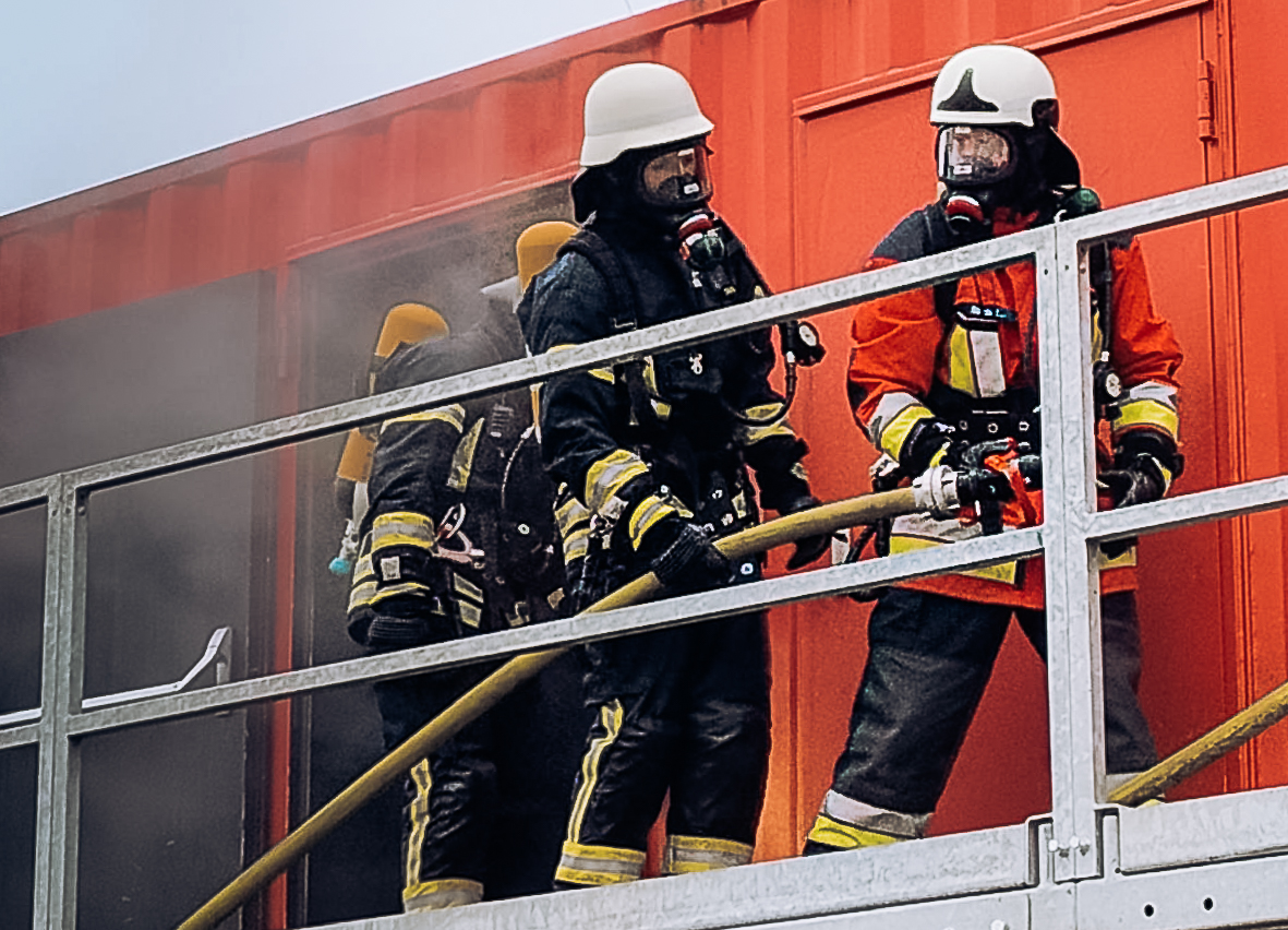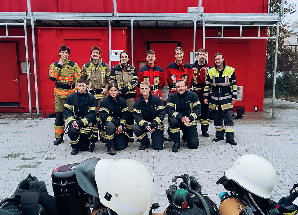Der Höhepunkt des Kurses war eine Abschlussübung in einer gasbefeuerten Brandsimulationsanlage. In dieser realitätsnahen Umgebung setzten die Teilnehmer das Erlernte unter kontrollierten Bedingungen um. Dabei standen nicht nur das sichere Arbeiten im Fokus, sondern auch das effektive Handeln im Team.