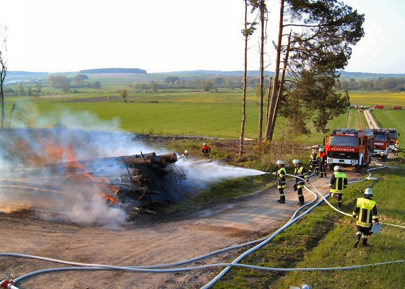 Aus noch ungeklärter Ursache gerieten am Freitag abend auf einem Feld zwischen Jedenhofen und Weichs dort gelagerte Hackschnitzel in Brand. Begünstigt durch den dort herrschenden böigen Wind konnten sich die Flammen rasch ausbreiten und griffen auf ein nahe gelegenes Waldstück über. Durch den schnellen Einsatz der Feuerwehren Asbach, Pasenbach, Vierkirchen und Weichs konnte das Feuer unter Einsatz mehrerer Rohre der Stärken B und C unter Kontrolle gebracht und gelöscht werden. Zur Wasserversorgung musste von den Einsatzkräften eine mehrere hundert Meter lange Förderleitung von Jedenhofen zur Brandstelle aufgebaut werden; zusätzlich wurden vom Einsatzleiter, Kreisbrandmeister Georg Reischl, die Tanklöschfahrzeuge der Wehren aus Indersdorf und Petershausen angefordert, die im Pendelbetrieb zusätzlich Wasser an die Schadensstelle brachten. Insgesamt befanden sich 85 Feuerwehrmänner mit 15 Fahrzeugen im Einsatz, verlegt wurden ca. 1.300 Metern an Schlauchmaterial – die Brandfläche betrug ca. 600 m2. Ein neuerlicher Brand in einem Waldstück zwischen Biberbach und Milbertshofen ließ am Sonntag (07.05.06) die Feuerwehren Biberbach und Röhrmoos tätig werden; beim Eintreffen der Kräfte mussten jedoch lediglich noch bestehende Glutnester abgelöscht werden.