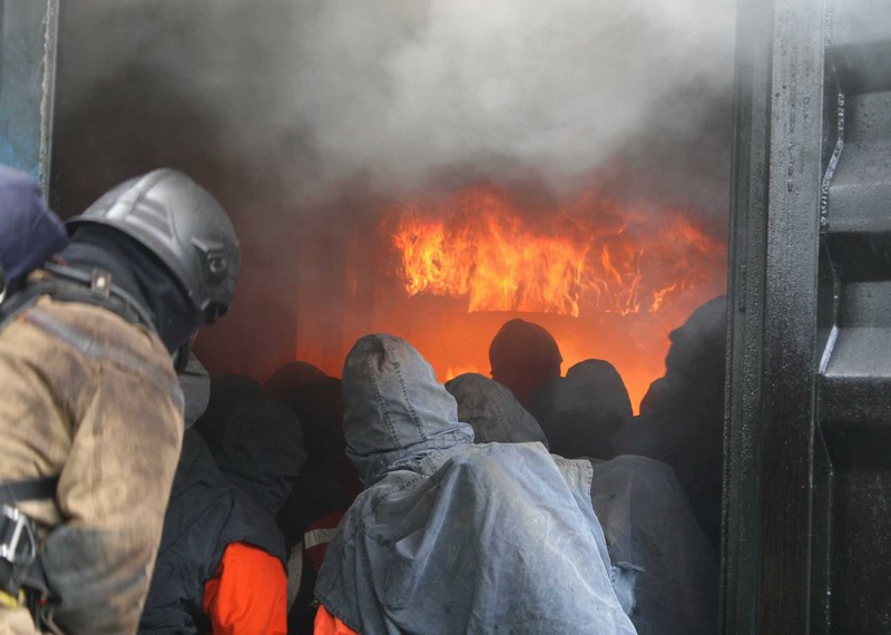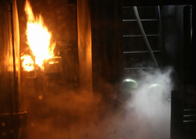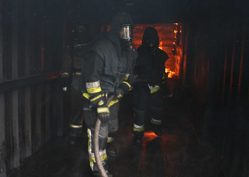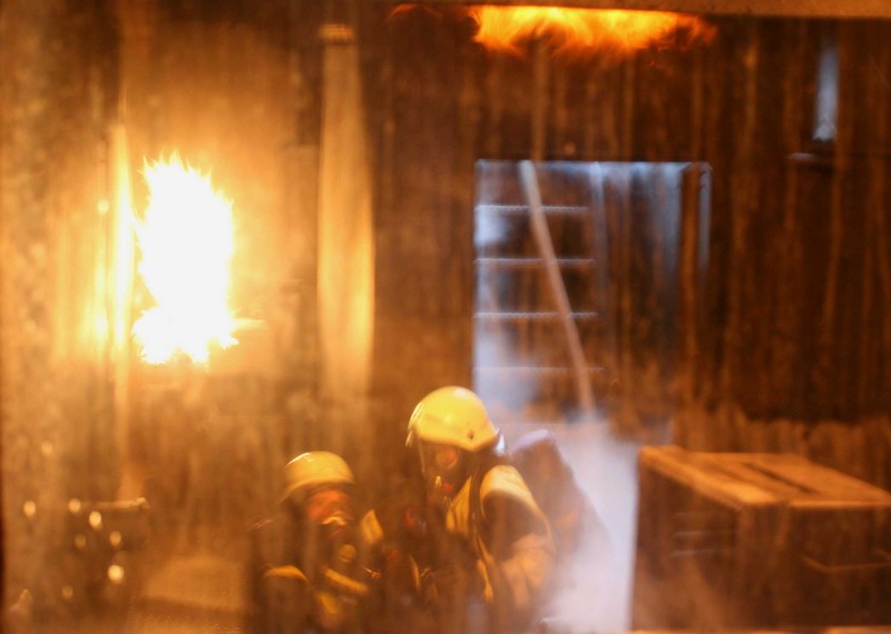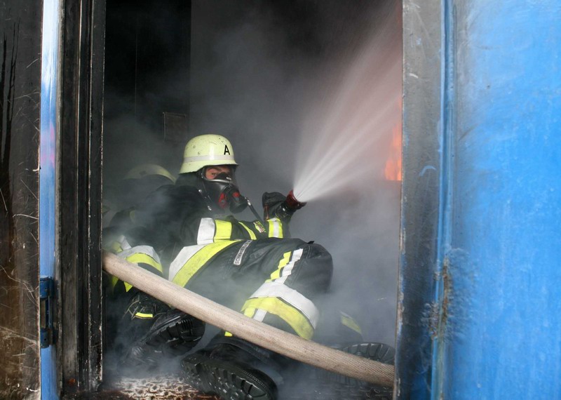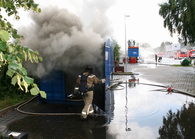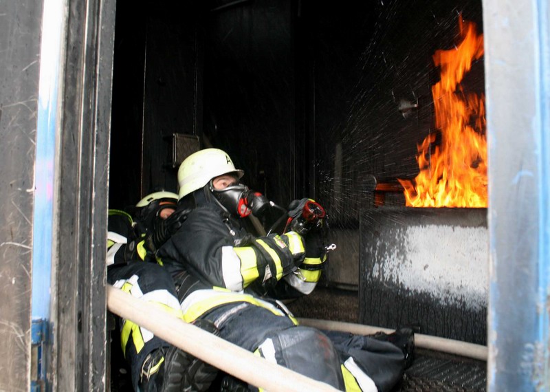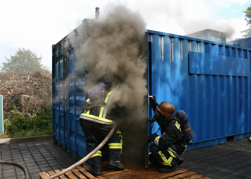 Richtig eingeheizt wurde den Teilnehmern in einem feststoffbefeuerten Brandcontainer. Hierbei wurde den Atemschutzträgern gezeigt, in welch kurzer Zeit sich ein Brand entwickeln kann und die Rauchentwicklung die Sicht versperrt. Zudem wurden die hohen Temperaturen von bis zu 1000 Grad spürbar, die nur mit einer modernen Schutzausrüstung ausgehalten werden können.