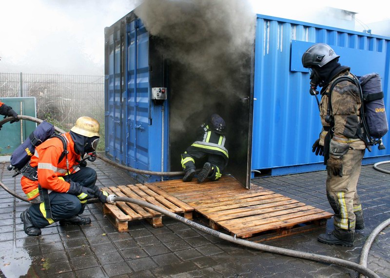 In einem gasbefeuerten Brandcontainer wurde das richtige Vorgehen bei einem Zimmerbrand sowie das Abdrehen einer brennenden Gasleitung geübt. Der Trupp hatte dabei immer auf die Sicherung des Rückweges sowie Rauchgasdurchzündungen zu achten.