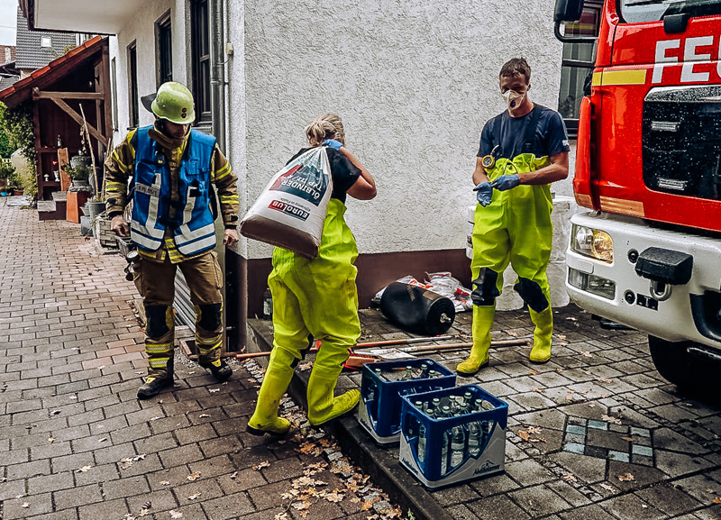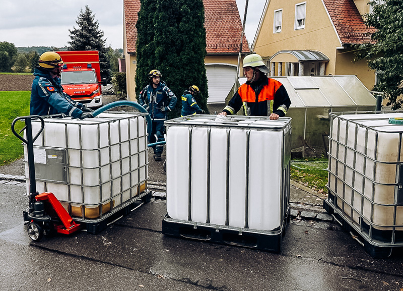 Parallel dazu wurde der Kanal vom Wohnhaus bis zum ersten Gully gespült, um Ölreste zu beseitigen. Das aufgenommene Öl wurde fachgerecht gesammelt und entsorgt. Die Feuerwehr Hebertshausen unterstützte den Einsatz durch die Bereitstellung zusätzlicher IBC-Container aus dem Katastrophenschutzzentrum.