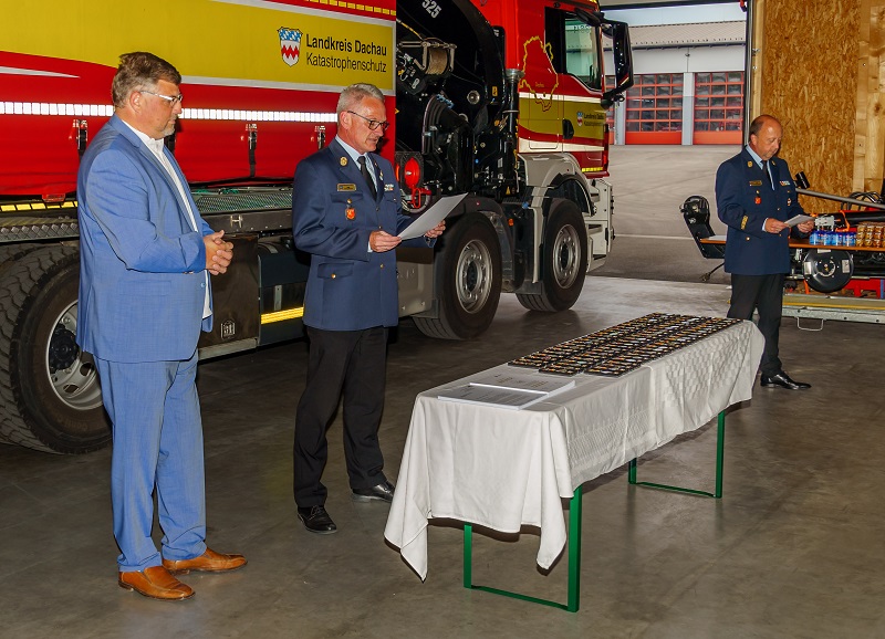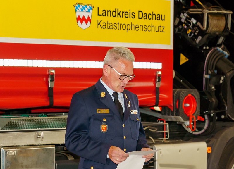 Kreisbrandrat Georg Reischl gab in seiner Rede einen kurzen Rückblick über den Verlauf des Feuerwehr-Kontingenteinsatzes; am 3. August 2021 erreichte den Landkreis Dachau über die Regierung von Oberbayern ein Hilfeleistungsersuchen des Bundeslands Rheinland-Pfalz. Zusammen mit weiteren Kräften aus Ober- und Niederbayern sollten die Dachauer Helfer Logistikaufgaben in einem Ölwehrkontingent übernehmen.