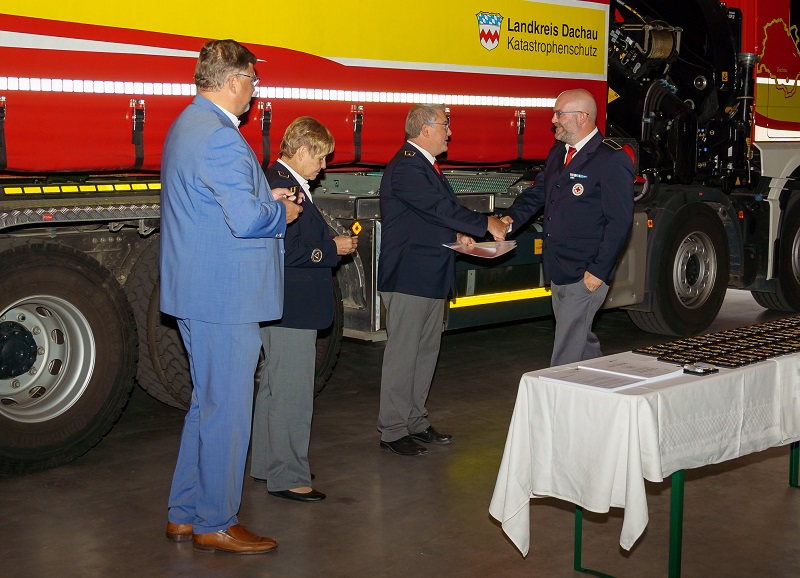 Im Anschluss erfolgte die Übergabe der Fluthelfer-Medaillen 2021 durch Landrat Stefan Löwl sowie die Vertreter des BRK-Ortsverbands Dachau und der Kreisbrandinspektion Dachau. Angelika Gumowski und Reinhard Weber vom BRK Dachau konnten neben der Fluthelfermedaille des Bundeslandes Rheinland-Pfalz auch noch eine Auszeichnung und ein Dankschreiben des Deutschen Roten Kreuzes an die teilnehmenden Helferinnen und Helfer des BRK überreichen.