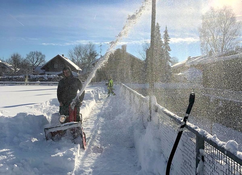 Seit dem Eintreffen um 8.30 Uhr sind die Dachauer Kräfte fleißig damit beschäftigt die Dächer der Oberland Realschule von der Schneelast zu befreien, bevor am Wochenende der angesagte Schneeregen kommt. Mit Schneefräsen und –schaufeln sowie viel Muskelkraft rücken sie dabei den Schneemaßen zu Leibe.