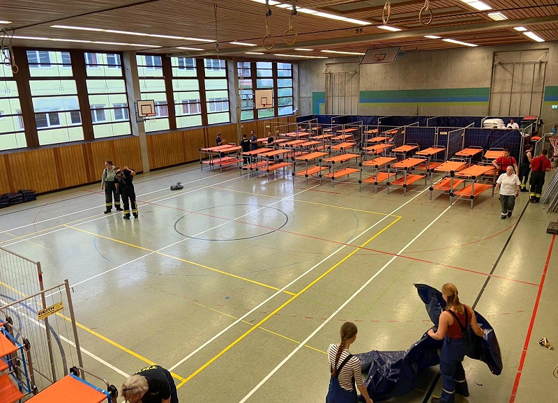 Helfer von Feuerwehr, BRK und THW bauten am vergangenen Mittwoch (31.08.2022) die für die Unterbringung von Flüchtlingen eingerichtete Notfallunterkunft an der ehemaligen Realschule in der Steinstraße ab.