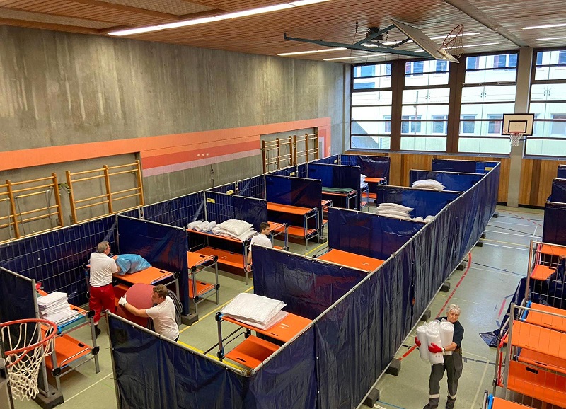 In mehrstündiger Arbeit wurden 140 Betten sowie Schränke und ein Aufenthaltsbereich aus der Turnhalle der Schule zurückgebaut und ein Lager in Hebertshausen transportiert.