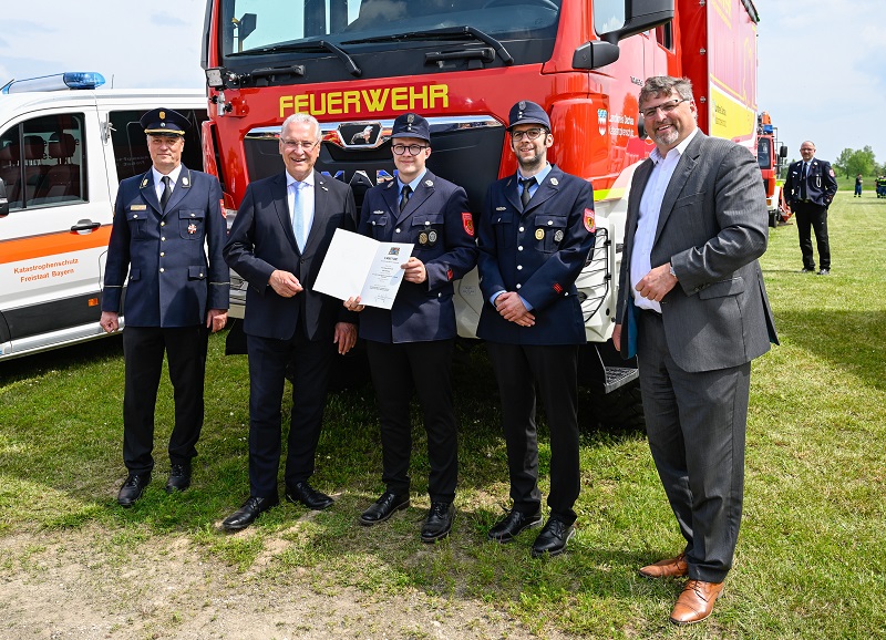 Für die offizielle Übergabe, welche mit einem Festakt auf dem Gelände der Ostbayernhalle feierlich begangen wurde, reiste neben einer Delegation der Feuerwehr Hebertshausen auch Landrat Stefan Löwl nach Amberg.