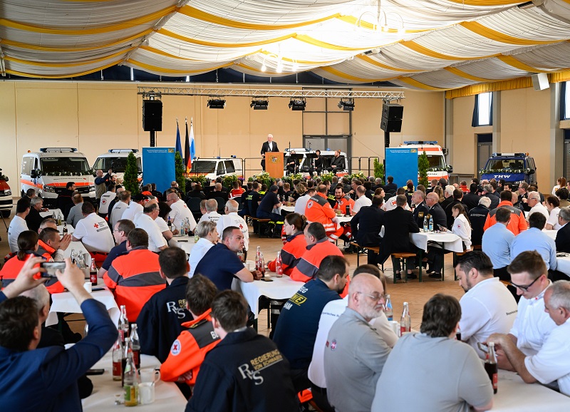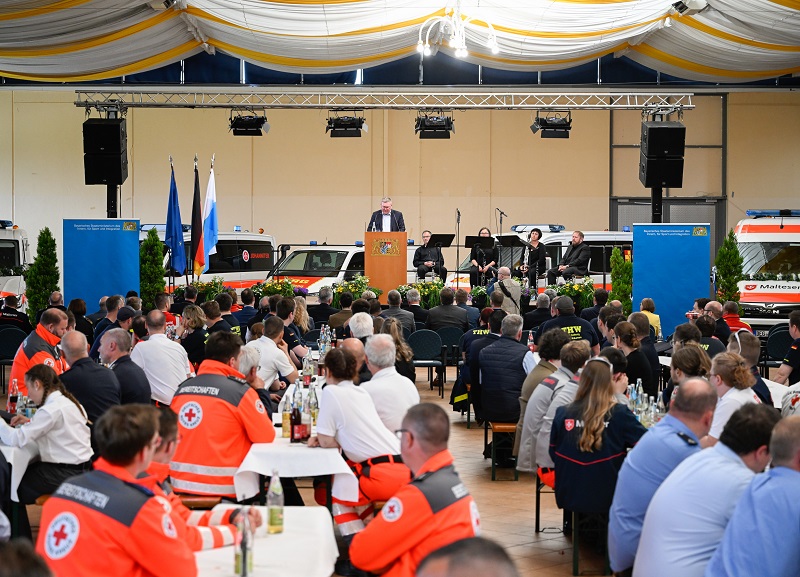 Neben Feuerwehren und Rettungsdiensten gratulierte Herrmann bei der Veranstaltung auch dem THW Landesverband Bayern zu 14 vom Bund finanzierten neuen Einsatzfahrzeugen.