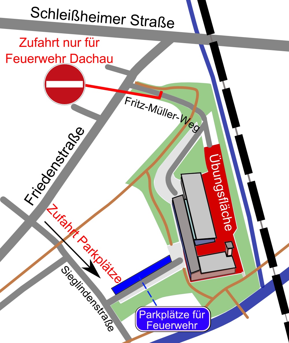 Die Zufahrt über den Fritz-Müller-Weg ist für den Einsatzfall für die Kräfte der Feuerwehr Dachau freizuhalten. Für Teilnehmer der Jugendleistungsprüfung stehen Parkplätze hinter dem Feuerwehrgerätehaus (Anfahrt über Sieglindenstraße) zur Verfügung.