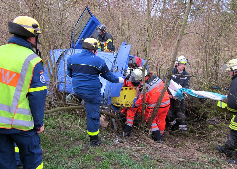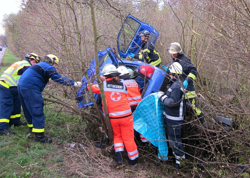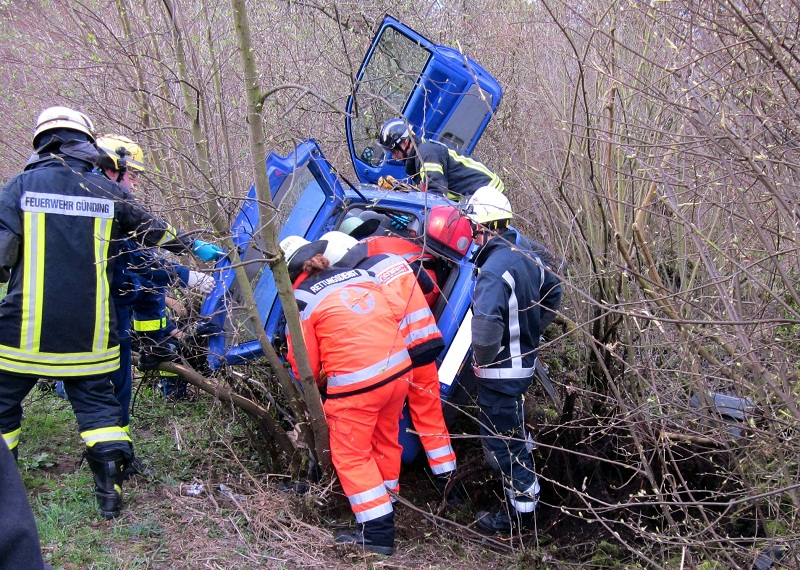 „Schwerer Verkehrsunfall – eine Person eingeklemmt“, so lautete die Einsatzmeldung für Feuerwehr, Rettungsdienst und Technisches Hilfswerk am Mittwochmorgen gegen 7.30 Uhr. Ein 20-Jähriger ist mit seinem VW Lupo auf der Gündinger Kanalstr. in Richtung Eschenried unterwegs gewesen, als er kurz nach der Amperbrücke aus noch ungeklärter Ursache nach rechts von der Fahrbahn abkam.Der Kleinwagen landete zwischen Sträuchern und Bäumen und blieb auf der Fahrerseite liegen. Da sich der junge Mann nicht mehr selbst aus seinem Fahrzeug befreien konnte, musste er von der Feuerwehr Günding und dem Technischen Hilfswerk gerettet werden.