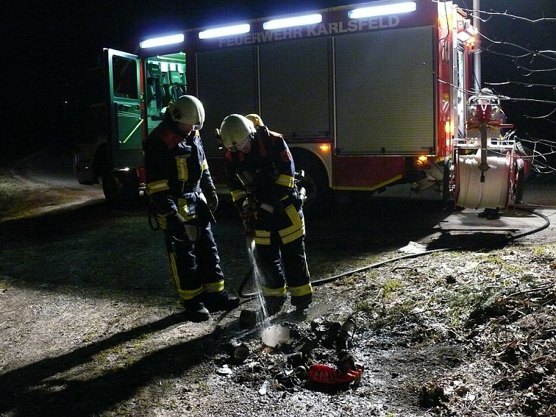 Zu einem Kleinbrand musste die Karlsfelder Feuerwehr am Sonntag Abend in den Hadinger Weg ausrücken. Unbekannte entsorgten hier einige Mengen an Unrat und zündeten diesen an.Eine vorbeifahrende Passantin, welche per Handy umgehend die Feuerwehr benachrichtigte, handelte sofort und löschte die brennenden Abfälle mit einem im PKW vorhandenen Feuerlöscher ab. In Folge dessen war beim Eintreffen der Einsatzkräfte das Feuer bereits gelöscht. Mittels Schnellangriff wurden noch einzelne Nachlöscharbeiten vorgenommen.