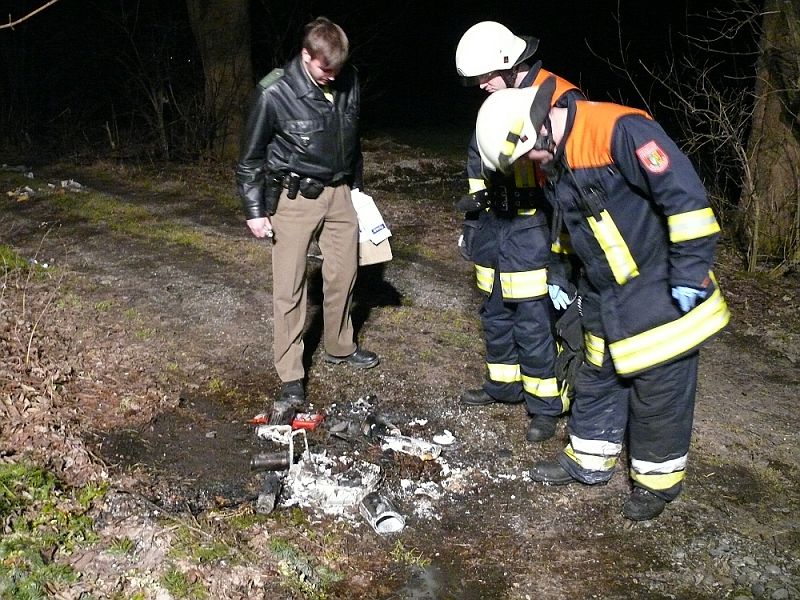 Nachdem die Einsatzstelle mit einer Wärmebildkamera auf eventuell weitere vorhandene Brandnester abgesucht wurde, unterstützten die Kameraden die Polizei bei der Suche auf Hinweisen zu den Umweltsündern. Diese stellte einige Beweismittel sicher und nimmt die weiteren Ermittlungen auf. Zehn Einsatzkräfte waren eine Stunde vor Ort mit den Arbeiten beschäftigt.