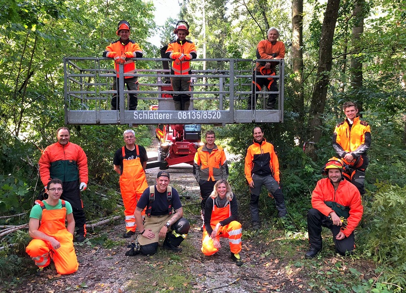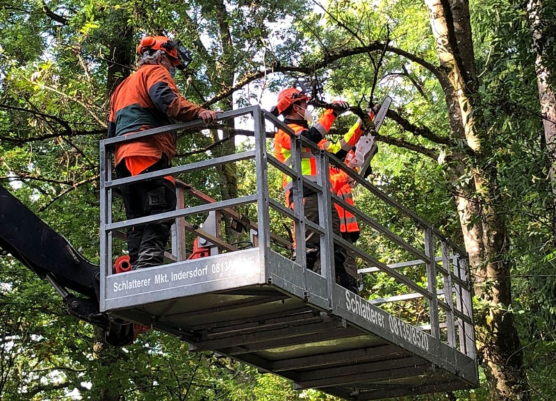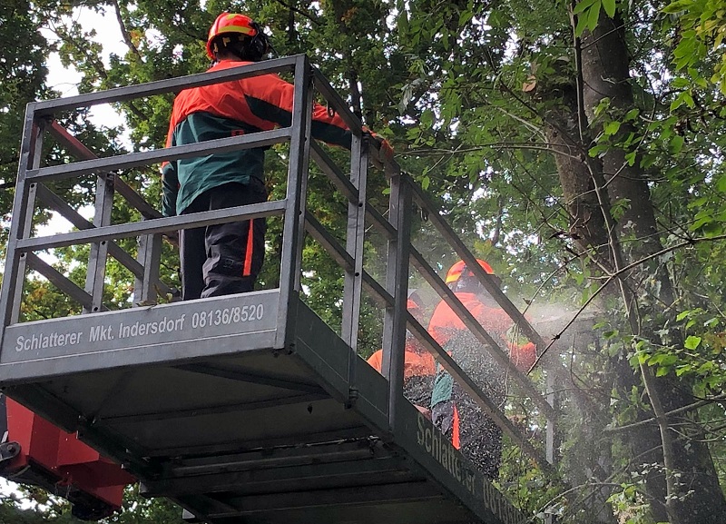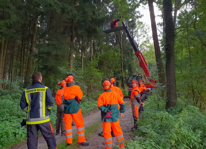 Im Anschluss ging es in ein Waldstück nahe Unterweilbach, wo verschiedene Arbeits- und Schnitttechniken an Ästen und Kronenteilen sowie das Absetzen von Ästen unterschiedlicher Stärke praktisch beübt wurden. Die Ausbildung fand dabei realitätsnah in einem Arbeitskorb statt, der die Übungseinheiten in einer Höhe von bis zu 18 Metern ermöglicht.