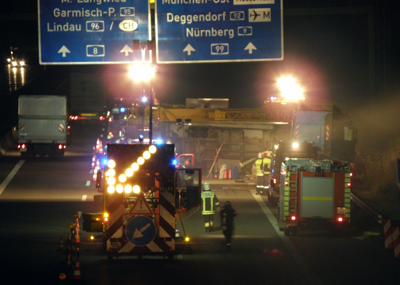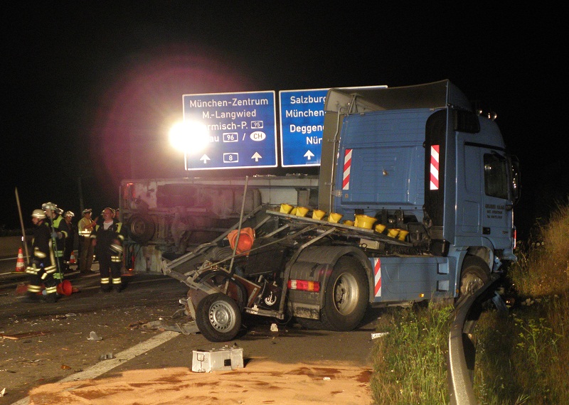 Erneut forderte ein Verkehrsunfall auf der A 8 den Einsatz der Feuerwehren der Landkreise Dachau und Fürstenfeldbruck.In den frühen Morgenstunden des Mittwochs rammte aus noch ungeklärter Ursache ein Lkw-Fahrer einen Verkehrssicherungsanhänger, kam dadurch ins Schleudern, überschlug sich und kam seitlich auf der Fahrbahn zum Liegen.