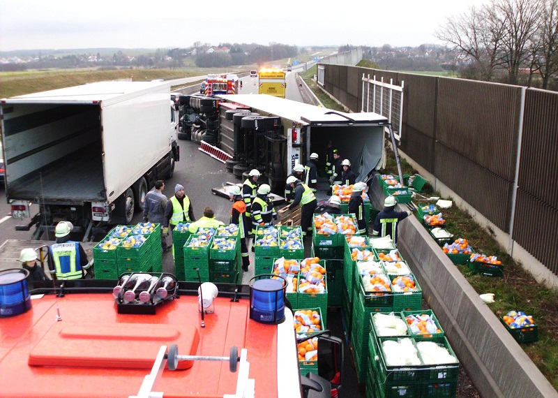In den frühen Morgenstunden des Donnerstag (29.12.2011) wurden Einsatzkräfte von Feuerwehr und Rettungsdienst zu einem LKW-Unfall auf der Autobahn A8 alarmiert. Ein mit 22 Tonnen Südfrüchten beladener LKW hat zwischen den Anschlussstellen Adelzhausen und Odelzhausen die Betonleitplanke touchiert und kippte daraufhin um.Der LKW-Fahrer wurde bei dem Unfall glücklicherweise nicht verletzt, zur Untersuchung wurde er jedoch vorsorglich ins Klinikum Dachau eingeliefert.