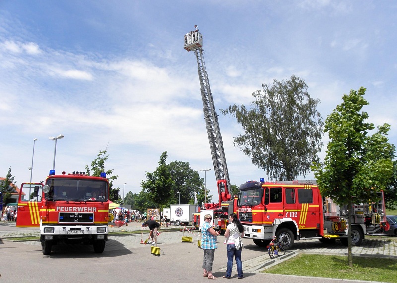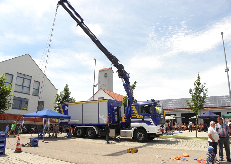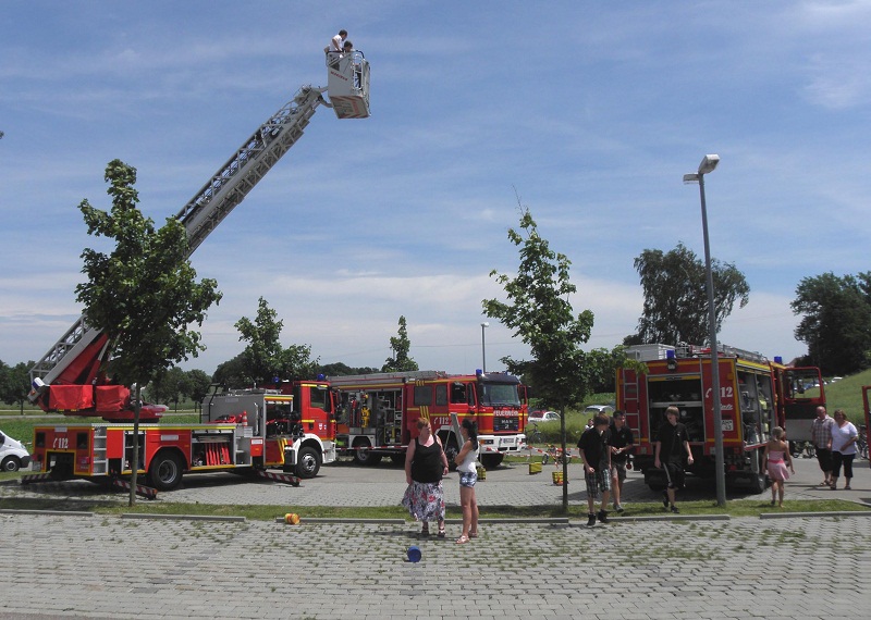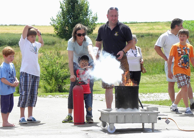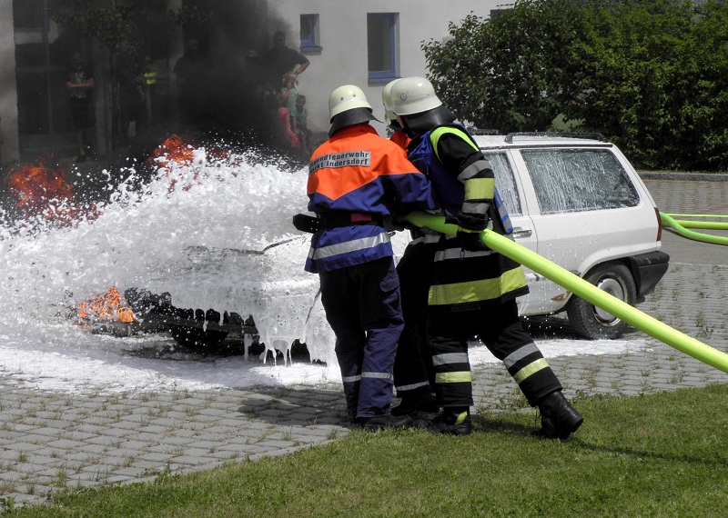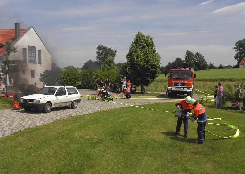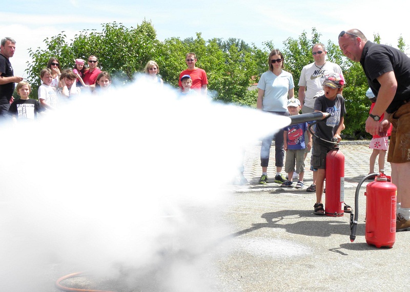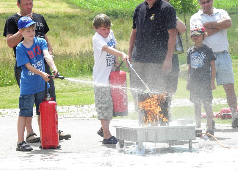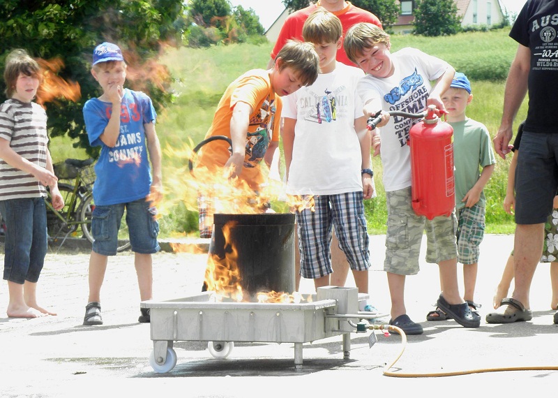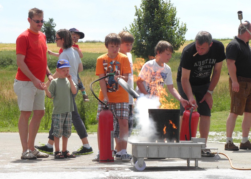 Seinen ersten Einsatz hatte der Brandsimulator gleich nach der Übergabe auf dem Gartenfest der Indersdorfer Floriansjünger, wo sich die Besucher im Löschen eines brennenden Papierkorbs üben konnten. Vor allem die Kinder waren mit Begeisterung bei der Brandbekämpfung zugange und trainierten spielerisch den Umgang mit dem Feuerlöscher.