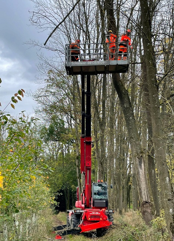 Im Anschluss ging es in ein Waldstück bei Günding, wo verschiedene Arbeits- und Schnitttechniken an Ästen und Kronenteilen sowie das Absetzen von Ästen unterschiedlicher Stärke praktisch beübt wurden. Die Ausbildung fand dabei realitätsnah in einem Arbeitskorb statt, der die Übungseinheiten in einer Höhe von bis zu 18 Metern ermöglicht.