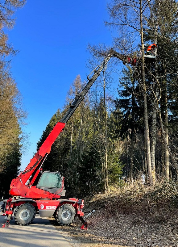 v Im Anschluss ging es in ein Waldstück nahe Unterweilbach, wo verschiedene Arbeits- und Schnitttechniken an Ästen und Kronenteilen sowie das Absetzen von Ästen unterschiedlicher Stärke praktisch beübt wurden. Die Ausbildung fand dabei realitätsnah in einem Arbeitskorb statt, der die Übungseinheiten in einer Höhe von bis zu 18 Metern ermöglicht.