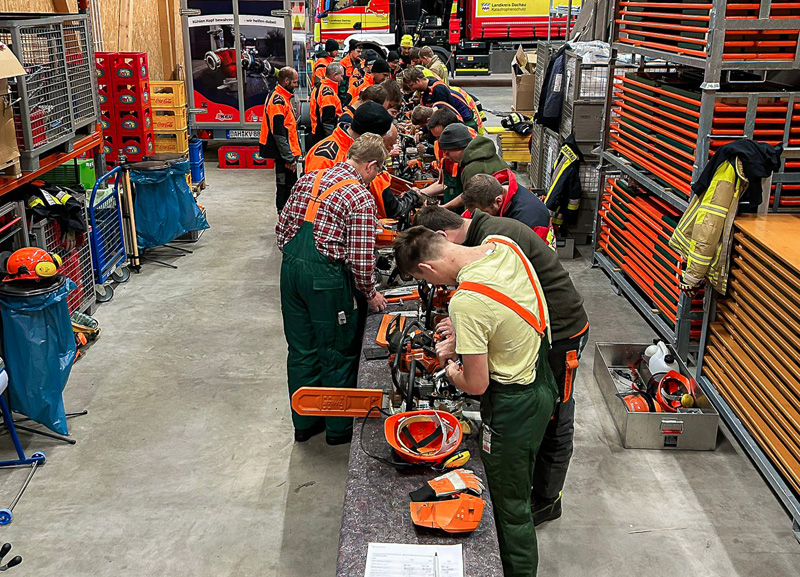 Der Kurs setzte sich aus einem fundierten Theorieteil sowie praxisnahen Übungen zusammen. Im Unterricht im Katastrophenschutzzentrum Hebertshausen erhielten die Teilnehmer Wissen zu Aufbau und Funktionsweise der Motorsäge, zu den wichtigsten Sicherheitsvorschriften sowie zu regelmäßiger Wartung und Pflege der Geräte.
