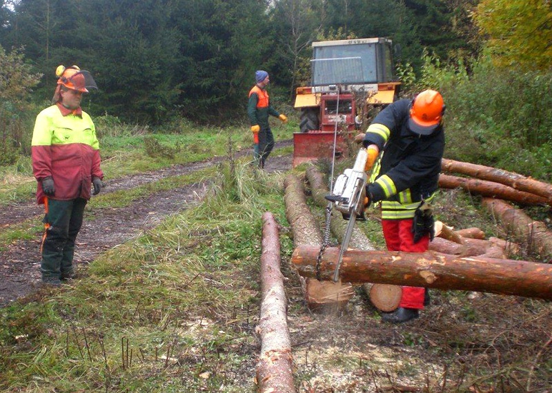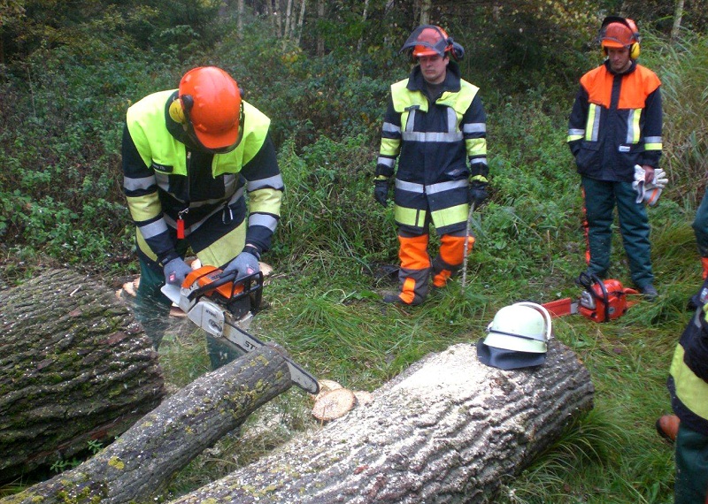 Im praktischen Teil der Ausbildung wird der Umgang mit der Motorsäge, deren Instandhaltung und das Schneiden von Holz, das unter Spannung liegt, geübt.