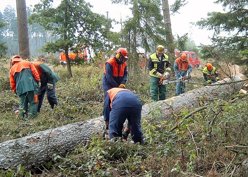 Erstmals wurde von der Kreisbrandinspektion Dachau ein Motorsägenkurs für die Feuerwehren im Landkreis angeboten, an dem 19 Feuerwehrmänner aus 12 Wehren teilnahmen. Der Kurs, der unter der Leitung von Forstwirtschaftsmeister Uwe Vater und Kreisbrandmeister Georg Reischl über einen Zeitraum von acht Tagen im Feuerwehrhaus Vierkirchen stattfand, beinhaltete den sicheren Umgang mit einer Motorsäge. Dabei wurden auch die verbundenen Gefahren und Belastungen bei der Arbeit mit dem Gerät aufgezeigt und vorgestellt. Insbesondere wurde die fachgerechte Arbeitsweise gemäß der Unfallverhütungs- und der staatlichen Arbeitsschutzvorschriften, der Betriebsanleitung, sowie die für die Arbeit mit der Motorsäge erforderliche persönliche Schutzausrüstung behandelt. Am Abschlusstag, an dem auch Kreisbrandrat Rudi Reimoser teilnahm, wurden die Grundkenntnisse in Theorie, wie z.B. Aufbau und Funktion einer Motorsäge, Pflege und Wartung, usw. behandelt. In einem Waldstück von unsrem Kammeraden Josef Irl hatten die Teilnehmer dann die Möglichkeit, persönlich u.a. Sägen am liegenden Holz, Schnitttechniken, sowie Beurteilen von Spannungen im Holz zu üben. In der Abschlussbesprechung zollten Fortwirtschaftsmeister Vater und Kreisbrandmeister Reischl den Teilnehmern hohes Lob und Engagement für ihre Mitarbeit.