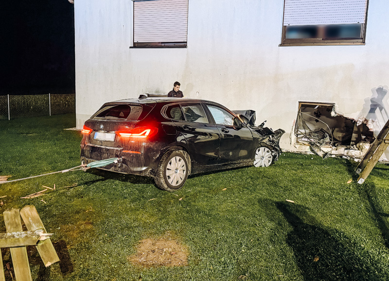 Nachdem die polizeiliche Unfallaufnahme abgeschlossen war, wurde der BMW aus dem Gebäude gezogen. Die Feuerwehr unterstützte den Hauseigentümer anschließend bei der provisorischen Verschalung des beschädigten Gebäudeteils, um weitere Gefahren zu verhindern.