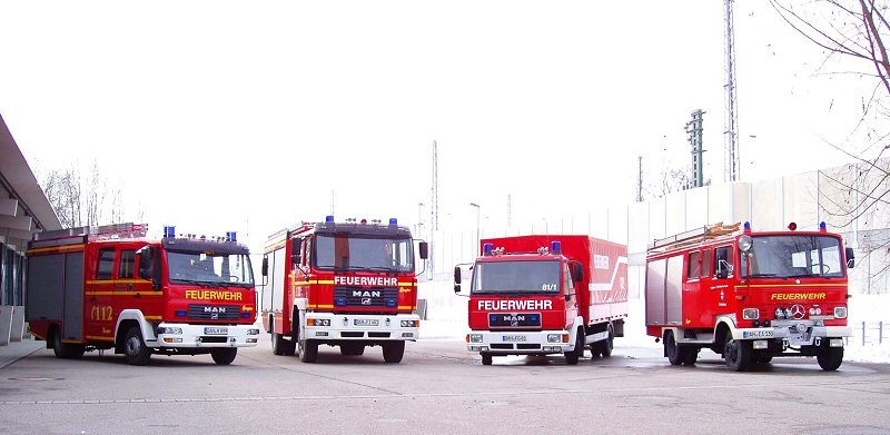 Für den Jahresbericht 2004 der Kreisbrandinspektion und des Kreisfeuerwehrverbandes Dachau präsentierten die Feuerwehren des Landkreises Dachau ihre Fahrzeuge, die dort im letzten Jahr in Dienst gestellt wurden, vor dem Dachauer Gerätehaus. Foto von links: Löschgruppenfahrzeug LF 8/6 Feuerwehr Haimhausen; Hilfeleistungslöschfahrzeug LF 20/16 Feuerwehr Indersdorf, Versorgungsfahrzeug Feuerwehr Günding und Löschgruppenfahrzeug LF 8 Feuerwehr Eichhofen – nicht auf dem Foto Tragkraftspritzenfahrzeug TSF Feuerwehr Welshofen.Der Jahresbericht wird am kommenden Montag anlässlich der Verbandsversammlung der Feuerwehren des Landkreises in der Gaststätte Göttler in Rumeltshausen durch Kreisbrandrat Rudi Reimoser vorgestellt.