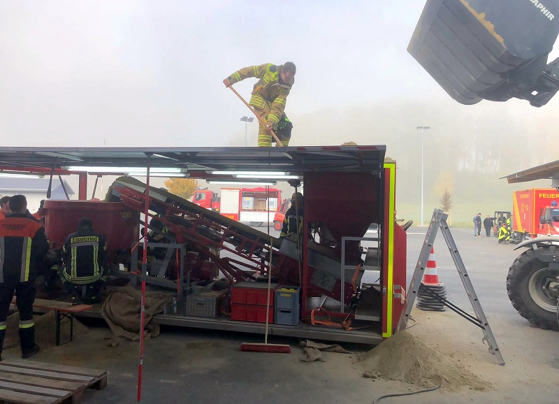 Auch der bisher am Stadtbauhof Dachau gelagerte Sand für Hochwasserlagen wurden von THW und Feuerwehr nach Hebertshausen transportiert und dort im Rahmen einer Übung 1.500 Sandsäcke neu befüllt.