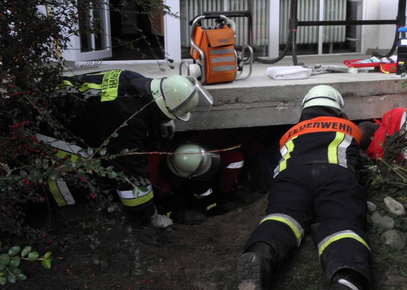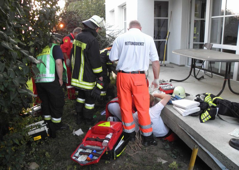 Nur durch Zufall wurde eine verletzte Person im Erdweger Ortsteil Bogenried am Mittwochabend von einem Bewohner entdeckt.Vermutlich beim Besteigen einer Leiter rutschte der Mann auf dieser aus und kam - längere Zeit unbemerkt - unter der Betonplatte der Terrasse zum Liegen, wo der Verletzte eingeklemmt wurde.