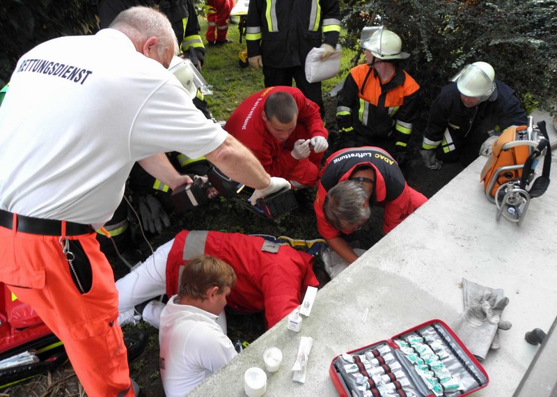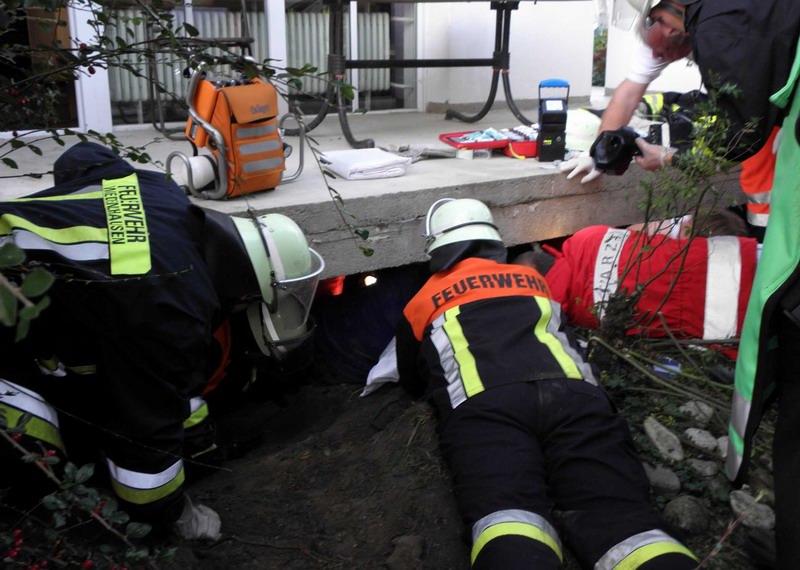 In schweißtreibender Arbeit schaufelten die Feuerwehrkräfte einen Zugang zu dem Verletzten, um ihn aus seiner misslichen Lage zu befreien; zeitgleich zwängten sich weitere Feuerwehrmänner und Kräfte des Rettungsdienstes in den engen Spalt und übernahmen zusammen mit dem Notarzt die medizinische Erstversorgung.