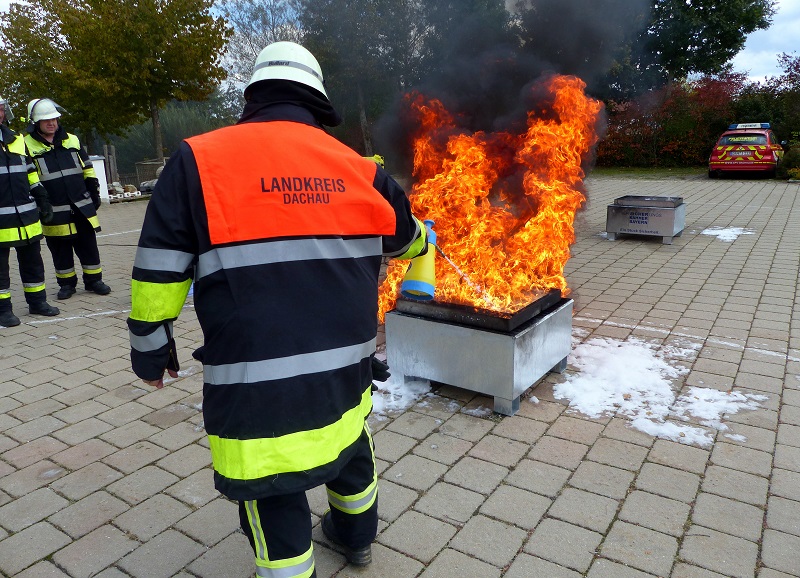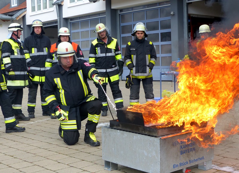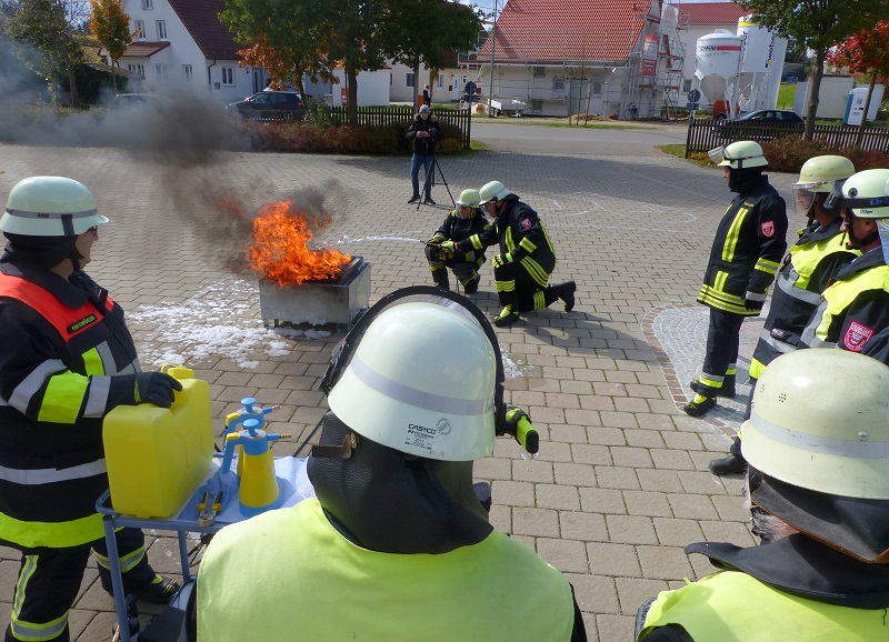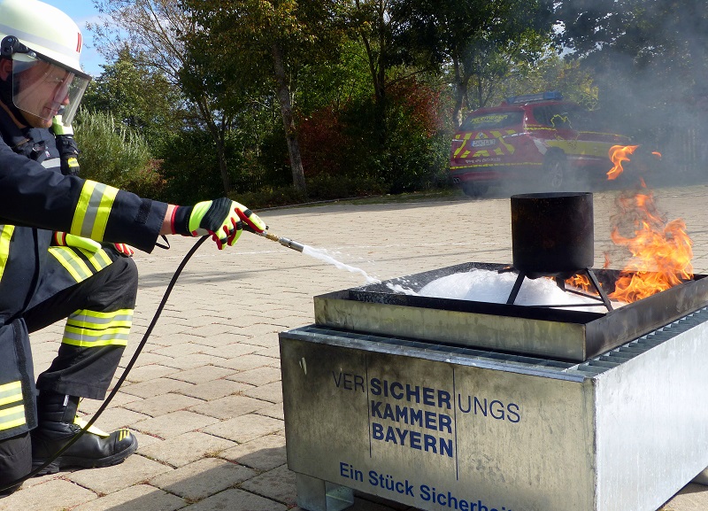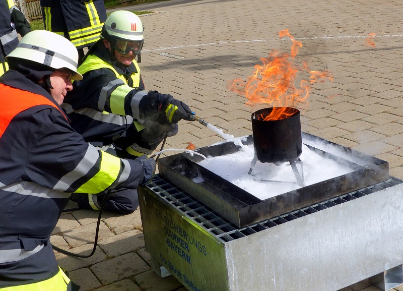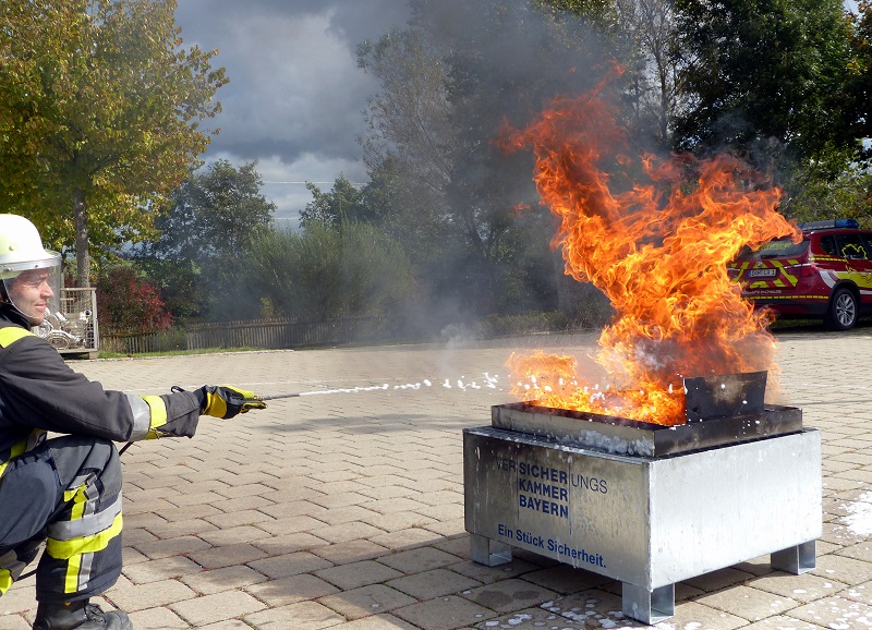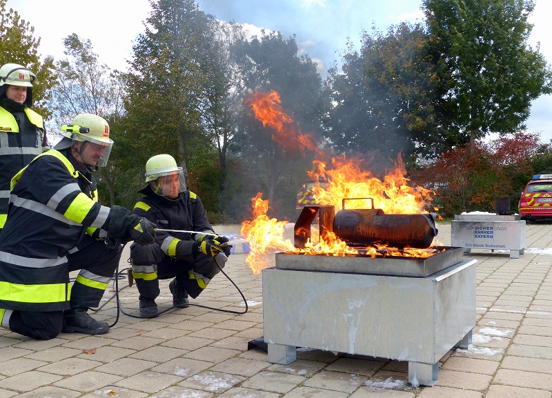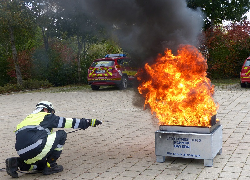 Im Rahmen des Feuerwehr-Sponsorings der Versicherungskammer Bayern erhielt daher jeder Landkreis und jede kreisfreie Stadt in Bayern einen Schaumtrainer zur Verfügung gestellt. Die Schaumtrainer-Ausbildung ist zukünftig auch fester Bestandteil im Ausbildungsprogramm der Kreisbrandinspektion Dachau, am Samstag (07.10.2017) fand mit deren Mitgliedern auch gleich der erste Pilotkurs bei der Feuerwehr Altomünster statt.
