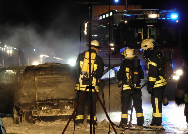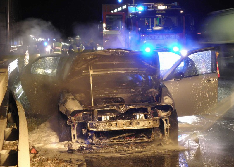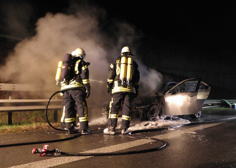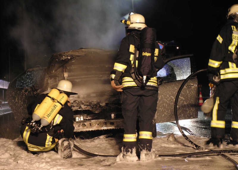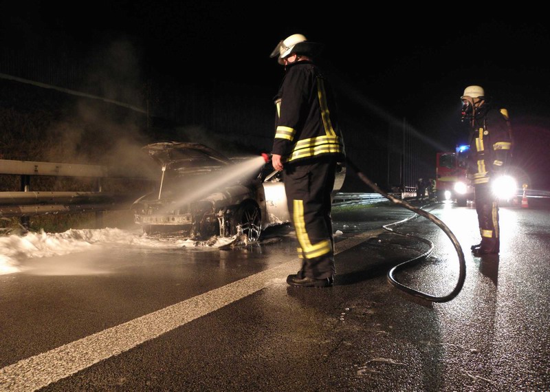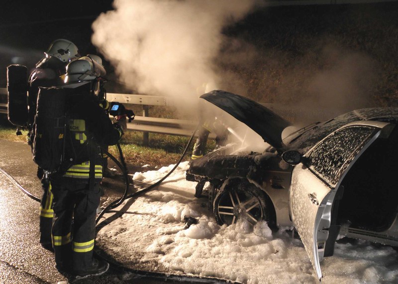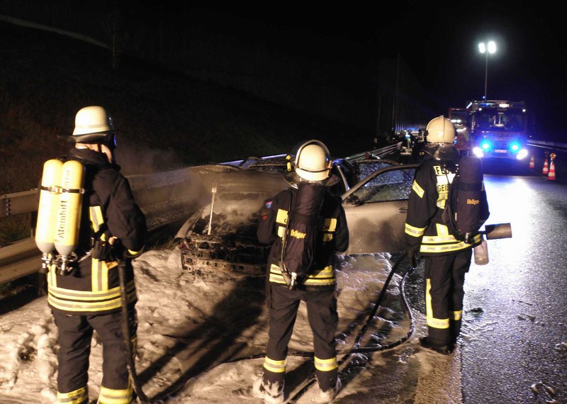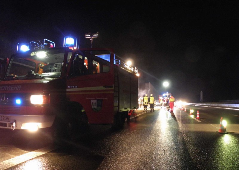 Vermutlich durch einen technischen Defekt geriet in den Nachtstunden des Donnerstages ein Pkw auf der A 8, zwischen den Ausfahrten Dachau und dem Parkplatz Fuchsberg in Brand. Der Alfa-Lenker bemerkte plötzlich eine Rauchentwicklung im Motorraum und brachte sein Fahrzeug noch rechtzeitig auf der Standspur zum Stillstand.Die alarmierten Feuerwehren Feldgeding und Geiselbullach setzten zur Brandbekämpfung zwei Schaumrohre ein; aufgrund der starken Rauchentwicklung mussten die Löscharbeiten unter schwerem Atemschutz durchgeführt werden – des weiteren übernahmen die Einsatzkräfte die Absicherung mittels Verkehrssicherungsanhänger, sowie die Ausleuchtung der Einsatzstelle.