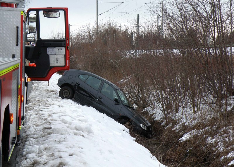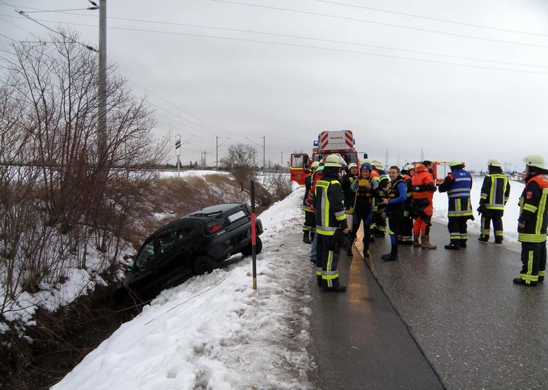 Um keinen Faschingsscherz handelte es sich am Sonntagnachmittag, nachdem die Integrierte Leitstelle ein Großaufgebot von Feuerwehr, Notarzt, Rettungsdienst und Wasserwacht alarmierte.Eine Zuginsassin bemerkte, dass zwischen Dachau und Karlsfeld ein Pkw über der Böschung an einem Bach hing und setzte daraufhin den Notruf ab. Da nicht bekannt war, ob sich in dem Fahrzeug Personen befanden, die evtl. verletzt oder eingeklemmt sind, wurden neben dem Notarzt, Rettungsdienst und Wasserwacht auch die Feuerwehren Dachau und Karlsfeld, sowie die Tauchergruppen der Berufsfeuerwehr München und der Feuerwehr Unterschleißheim alarmiert.