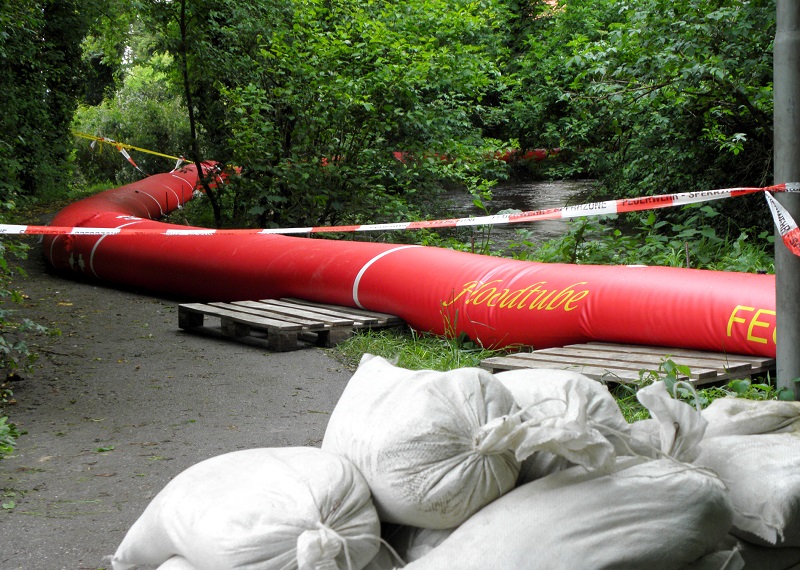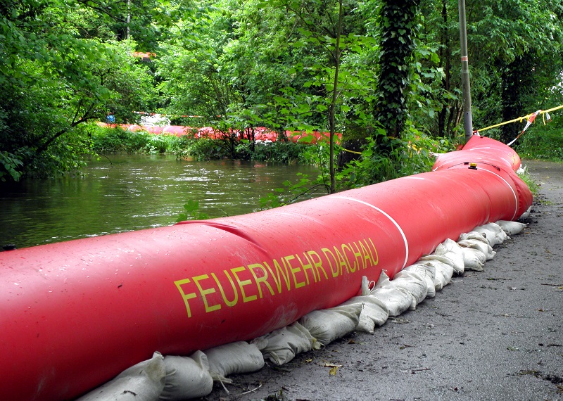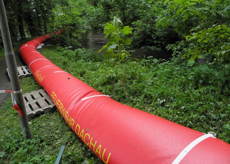 Am Dachauer Gröbenbach musste die Feuerwehr im Bereich der Taubenberger Straße einen mobilen Hochwasserschutz aufstellen, um die anliegenden Grundstücke vor einer Überflutung zu schützen.