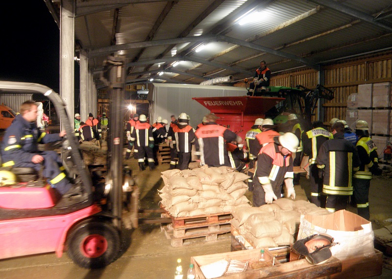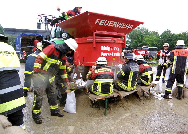 In den Nachmittagsstunden des Sonntag spitzte sich die Lage dramatisch zu. Um Einsatzmittel und –kräfte zu koordinieren, wurde umgehend die Kreiseinsatzzentrale des Landkreises besetzt. Ebenso wurde die „Dispogruppe Sandsack“ in Alarmbereitschaft versetzt, die am Dachauer Bauhof Sandsäcke für die überschwemmungsbedrohten Gebiete füllte. Insgesamt wurden bis Montagmittag 35.000 Sandsäcke gefüllt und anschließend an den diversen Schadensstellen verbaut. Während der anstrengenden Arbeiten wurden die Helfer vom Betreuungszug des Roten Kreuzes versorgt.