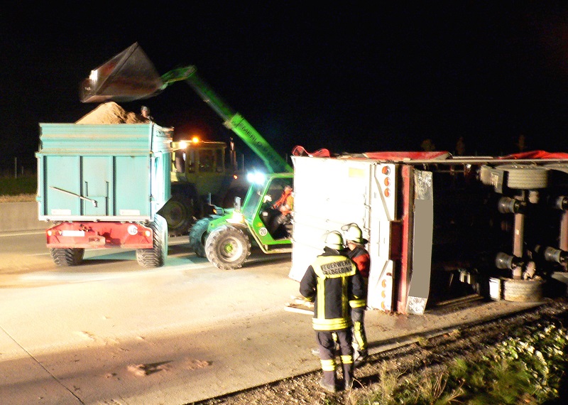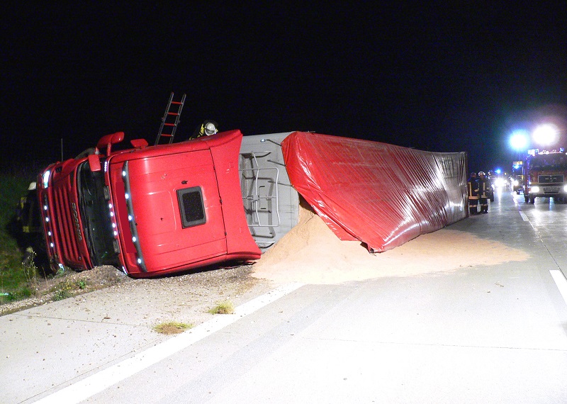 Der mit Weizenkleie beladene Sattelzug war in Richtung Stuttgart unterwegs, als der Fahrer zwischen den Anschlussstellen Sulzemoos und Odelzhausen nach rechts von der Fahrbahn abkam. Mit seinem Gespann fuhr er die Böschung hinauf, so dass der mit 24 Tonnen Futterkleie beladene Sattelzug umstürzte und auf dem Seitenstreifen zum Liegen kam.
