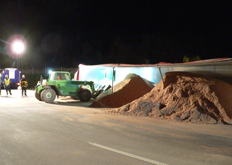 Die Ladung hat sich durch den Umsturz auf der Fahrbahn verteilt, ebenso wurde der Kraftstofftank des LKW´s aufgerissen.