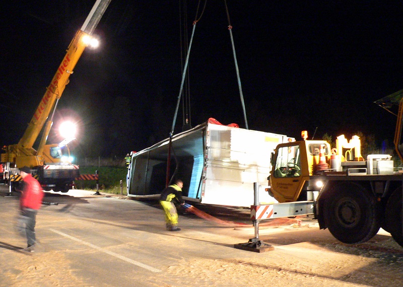 Zunächst musste die Kleie mit einem Bagger auf einen Ersatz-LKW umgeladen werden, bevor das Gespann durch zwei Autokräne aufgerichtet und abgeschleppt werden konnte. Das durch ausgetretenen Diesel verunreinigte Erdreich musste vom THW Dachau ausgebaggert und entsorgt werden, daneben pumpten die Helfer die restlichen 300 Liter Diesel aus dem Tank.