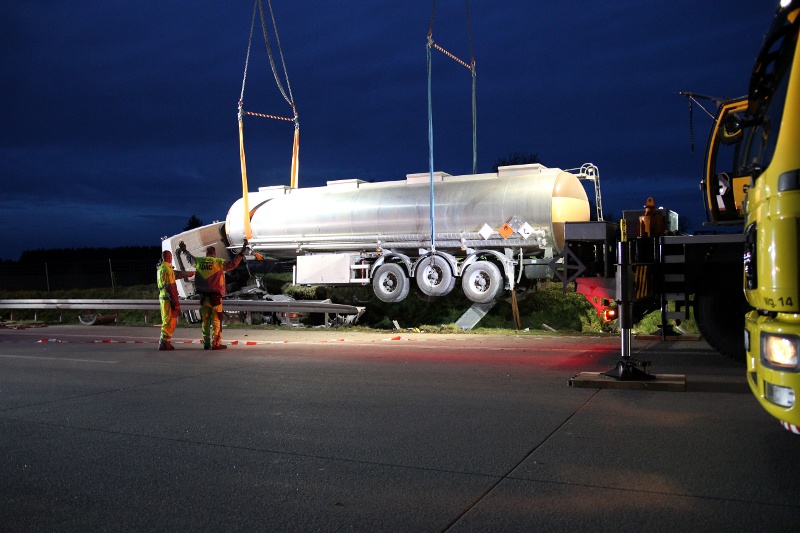 In der Zwischenzeit ist ein Tankfahrzeug des Spediteurs eingetroffen, welches schließlich den Gefahrstoff aus dem verunfallten Auflieger abgepumpt hat. Danach wurde der Sattelzug mit zwei Autokränen wieder auf die Fahrbahn gehoben und abgeschleppt.