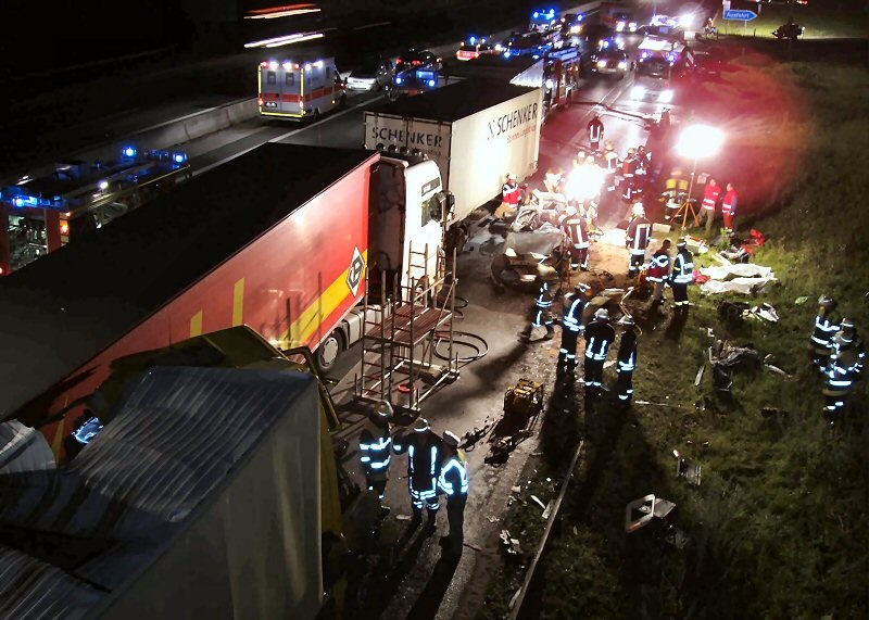 Bei einer schweren Massenkarambolage mit drei beteiligten Pkw´s , sowie drei Lkw´s erlitten in der Nacht auf Mittwoch (11.07.07) drei Personen tödliche Verletzungen, sowie weitere vier Personen schwere Verletzungen.