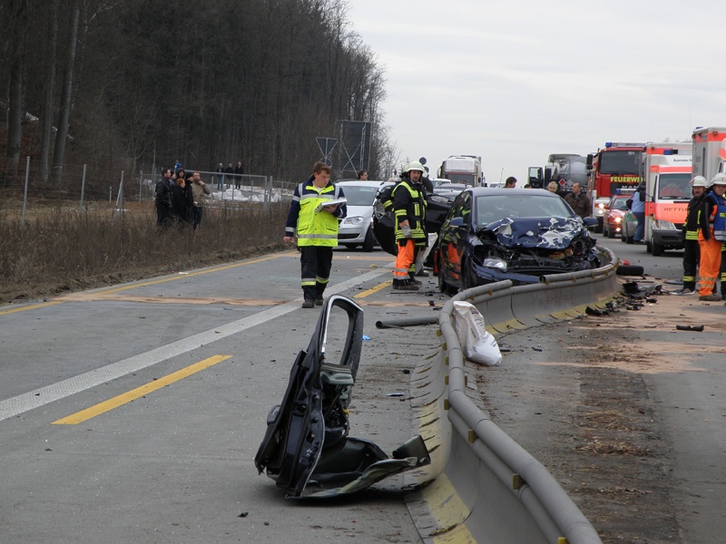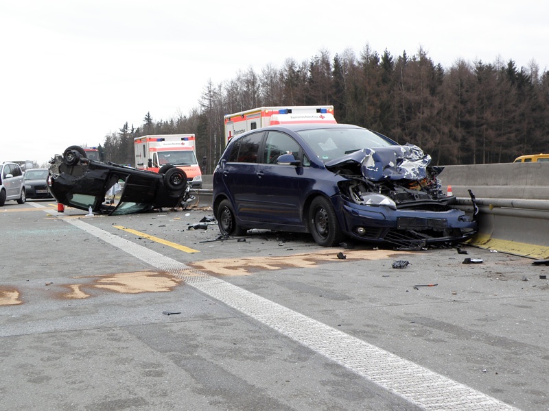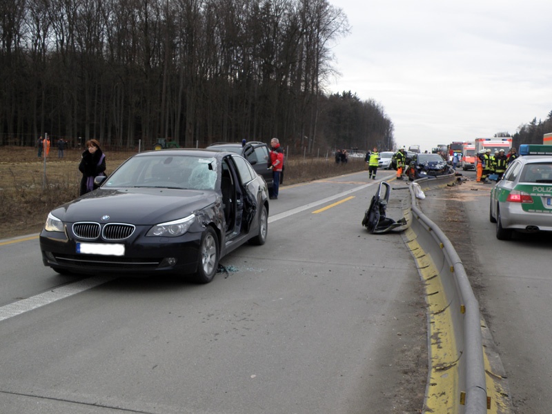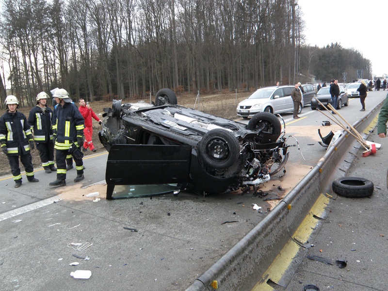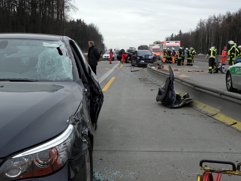 Fünf Verletzte und vier beteiligte Fahrzeuge war die Bilanz eines Verkehrsunfalls, der sich am Montagnachmittag auf der A 8 zwischen den Anschlussstellen Dachau und Sulzemoos ereignete.Aus noch ungeklärter Ursache kam der Lenker eines Pkw´s von der Fahrbahn in Richtung Stuttgart ab, überfuhr die dort angebrachten Betonschweller und stieß mit einem Pkw auf der Gegenfahrbahn zusammen; in weiterer Folge kam das Fahrzeug dann auf dem Dach zum Liegen. Durch die Wucht des Aufpralls wurde der Motorblock eines Fahrzeuges aus seiner Verankerung gerissen und blieb ebenfalls auf der Fahrbahn liegen. Ein weiterer Wagen, der in Fahrtrichtung München unterwegs war, wurde touchiert.