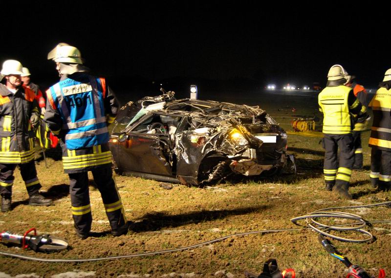 Am Samstagabend um kurz nach 20 Uhr wurde die Feuerwehr Haimhausen zu einem schweren Verkehrsunfall auf der B 13 alarmiert. Beim Eintreffen der Einsatzkräfte lag das völlig demolierte Fahrzeug nach mehrmaligem Überschlag im Acker, der Fahrer war noch in seinem Wrack eingeklemmt.Die ersten Kräfte der Feuerwehr Haimhausen unterstützten die "Helfer vor Ort" bei Erstversorgung des Fahrers und befreiten ihn mit hydraulischem Rettungsgerät aus seinem Fahrzeug.