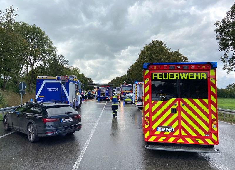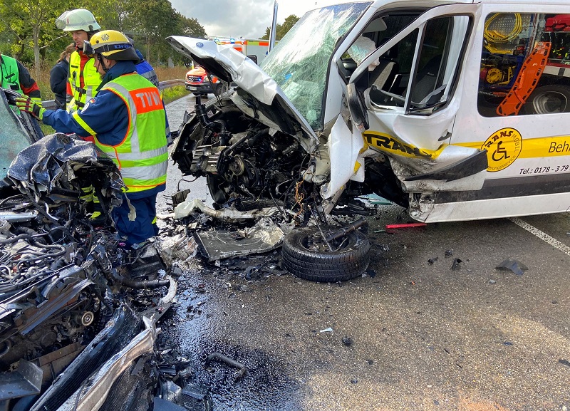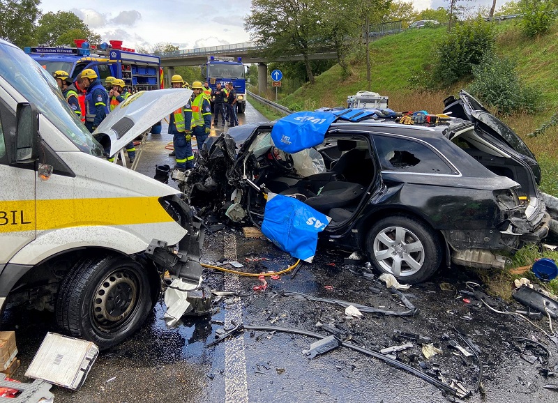Der Audi-Fahrer wurde in dem Wrack eingeklemmt und musste von Feuerwehr und THW mit hydraulischem Rettungsgerät befreit werden. Aufgrund der Schwere der Verletzungen wurden er und seine Tochter nach der medizinischen Erstversorgung durch den Rettungsdienst mit Hubschraubern in umliegende Kliniken zur weiteren Behandlung geflogen.