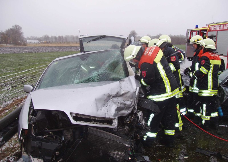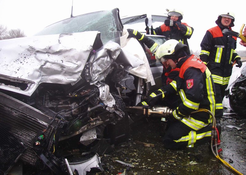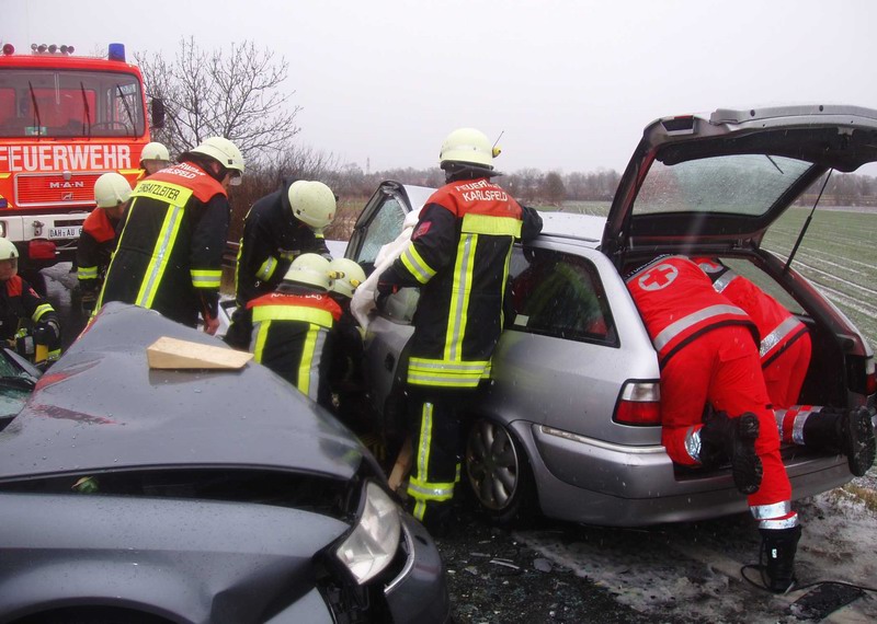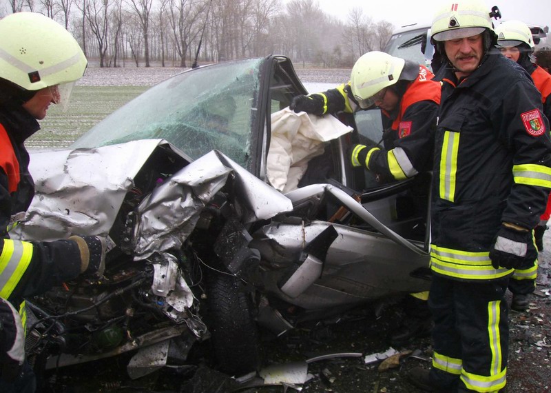 Dort waren aus noch ungeklärter Ursache zwei Kombis zusammen gestoßen, wobei ein Fahrer in seinem Fahrzeug eingeklemmt wurde und mittels Rettungsschere, -spreizer und –zylinder aus dem Wagen befreit werden musste. Beide Lenker wurden von Notarzt und Rettungsdienst vor Ort medizinisch versorgt und anschließend ins Krankenhaus eingeliefert.