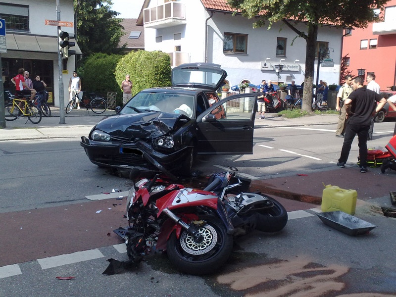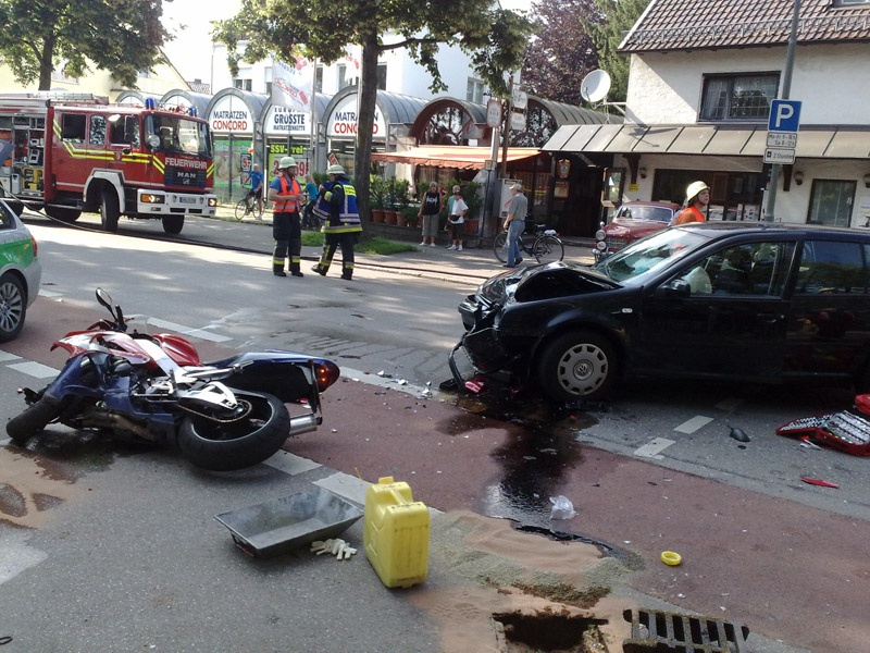 Am Montag, den 29. Juni 2009, kam es kurz vor 17 Uhr auf der Schleißheimer Straße in Höhe der Einmündung Landsbergerstraße zu einem schweren Verkehrsunfall. Aus bisher unbekannter Ursache stieß ein stadteinwärts fahrender Pkw frontal mit einem entgegen kommendem Motorrad zusammen. Der Motorradfahrer wurde mit dem Rettungshubschrauber in eine Klinik geflogen, wo er nach Aussage der Polizei wenige Stunden später verstorben ist.Die Freiwilligen Feuerwehren Dachau und Karlsfeld wurden zur Absicherung, Verkehrsregelung und Aufnahme auslaufender Betriebsstoffe alarmiert.